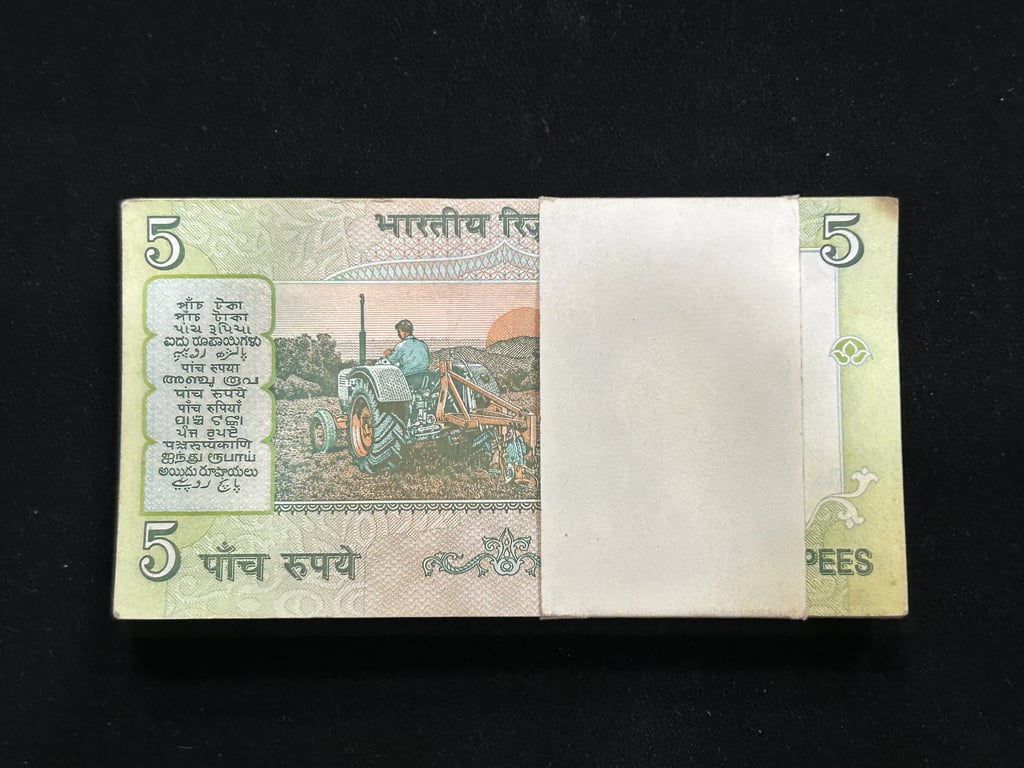 India, Rupees 5 Complete Serial Bundle of 100 Banknotes, Holy Fancy Serial Number Ending 214 (RAM), Gandhi Series, Sign. Y.V. Reddy, Inset L, UNC