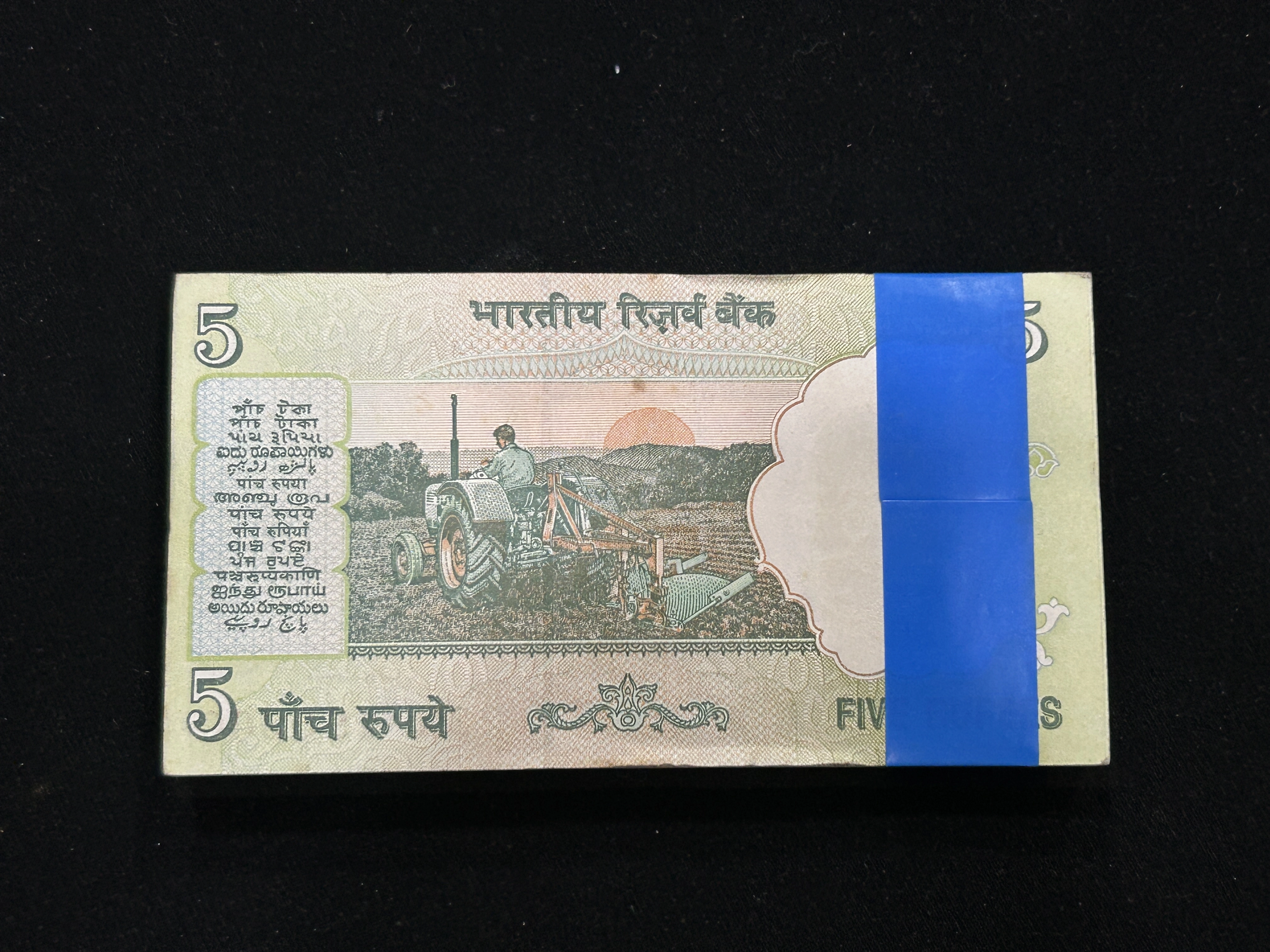 India, Rupees 5 Complete Serial Bundle of 100 Banknotes, Holy Fancy Serial Number Ending 786, Sign. Bimal Jalan, Inset L, UNC