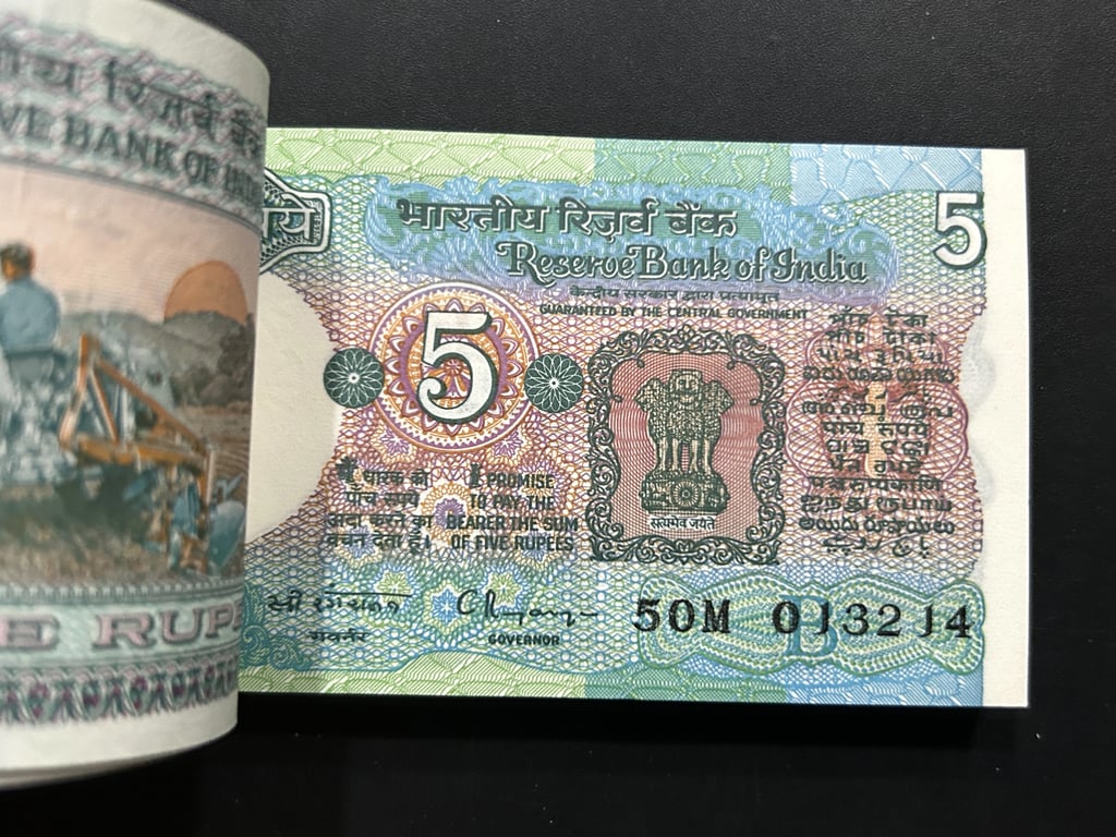 India, Rupees 5 Complete Serial Bundle of 100 Notes, Holy Fancy Serial Number Ending 214 (RAM) & 222, Tractor Issue, Sign. C. Rangarajan, Inset B, UNC