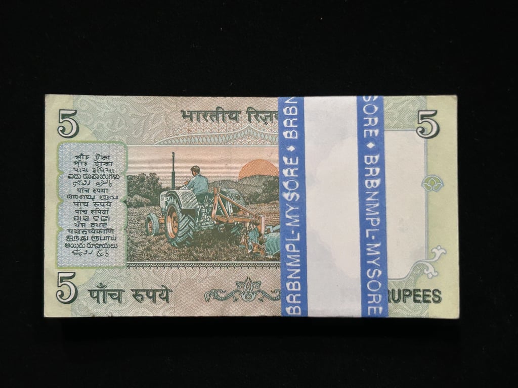 India, Rupees 5 Complete Serial Bundle of 100 Notes, Holy Fancy Serial Number Ending 786 & 777 & Fancy Doubling Serial Number 750-750, Gandhi Series, Sign. Bimal Jalan, Inset Plain, UNC