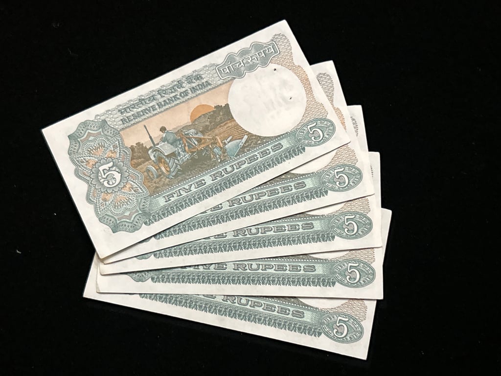 India, Rupees 5 x 5 Consecutive Serial Number Banknotes, Fancy Doubling Serial Number Ending xx10-10, Same Prefix (92A), Tractor Issue, Sign. Bimal Jalan, UNC