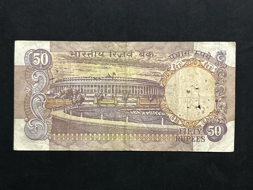 India, Rupees 50 Banknote, Fancy Tripling Serial Number 07-07-07, Parliament With Flag Issue, Sign. R.N. Malhotra, Inset Plain, Used Condition