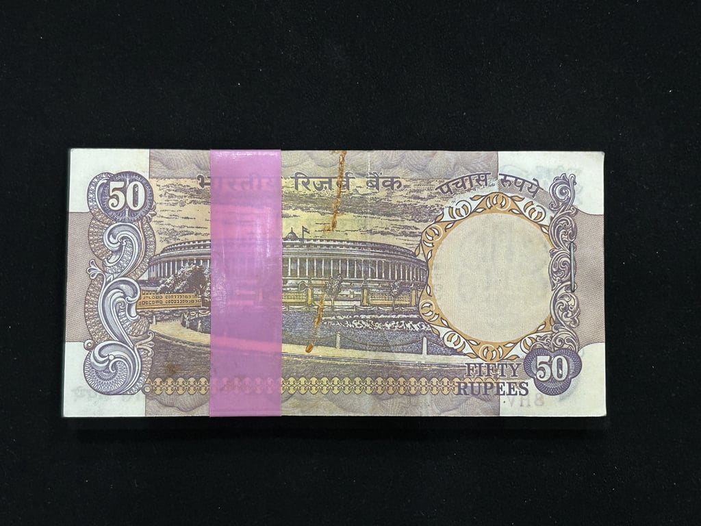 India, Rupees 50 Complete Serial Bundle of 100 Banknotes, Fancy Doubling Serial Number x55-x55, Fancy Serial Number Ending 420 & 444, Parliament Flag Issue, Sign. R.N. Malhotra