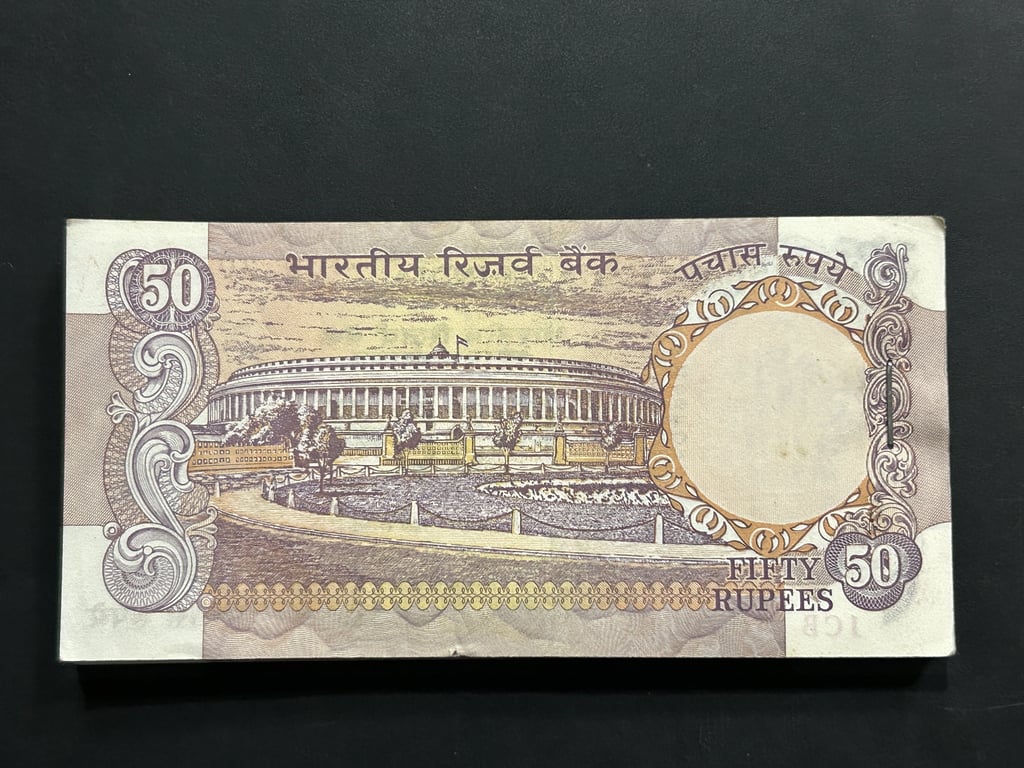India, Rupees 50 Complete Serial Bundle of 100 Notes, Fancy Serial Number Ending 108, 143 (I Love You) & 111, Parliament Flag Issue, Sign. C. Rangarajan, Inset C, UNC