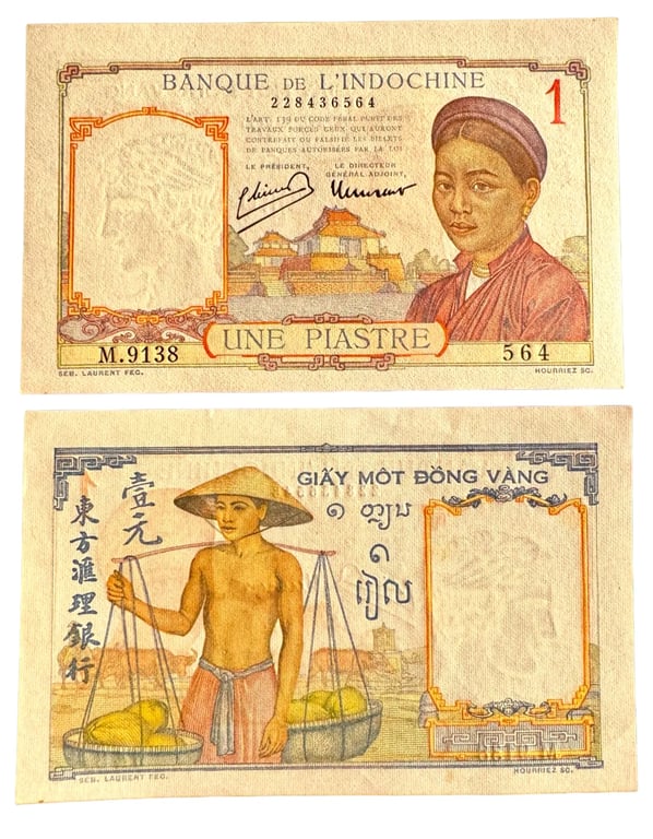 This large colorful, colonial banknote represents the 1st denomination of the French Indochinese Piastre (Series 1932-39). The observe features a Lao woman backed by a Buddhist temple. The reverse depicts a young peasant carrying coconuts and backed by Asian Water Buffalo (Note Size: 128 x 80 mm or 5.04 x 3.15 in)