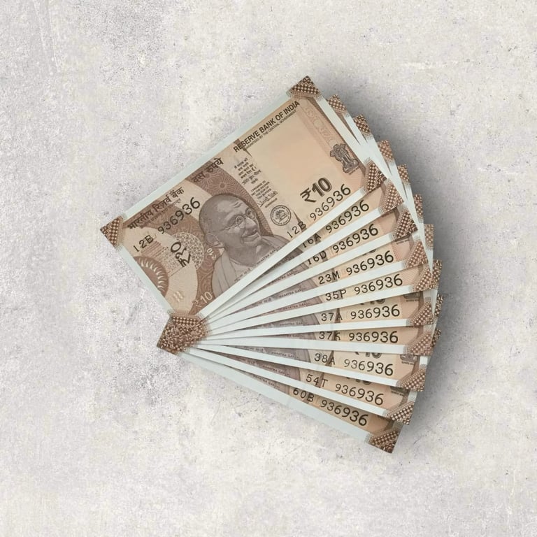 RS 10/- INDIA BANK NOTE SEMI FANCY 10 NOTE SAME NUMBER SET 936936 UNIQUE AND RARE