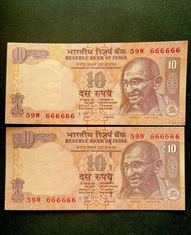 Rs 10 India Banknote TWIN SET Gem Unc Very Unique Set Solid Number 59W 666666