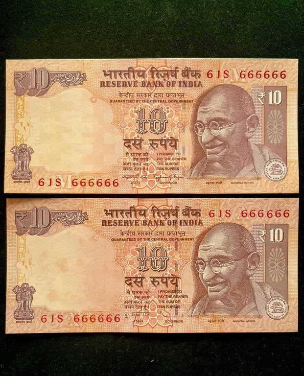 Rs 10 India Banknote TWIN SET Gem Unc Very Unique Set Solid Number 61S 666666