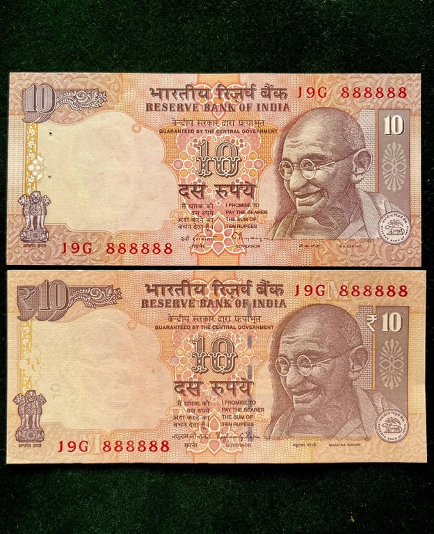 Rs 10 India Banknote TWIN SET Gem Unc Very Unique Set Solid Number 19G 888888