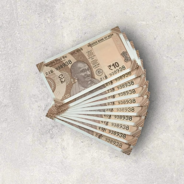 RS 10/- INDIA BANK NOTE SEMI FANCY 10 NOTE SAME NUMBER SET 938938 UNIQUE AND RARE
