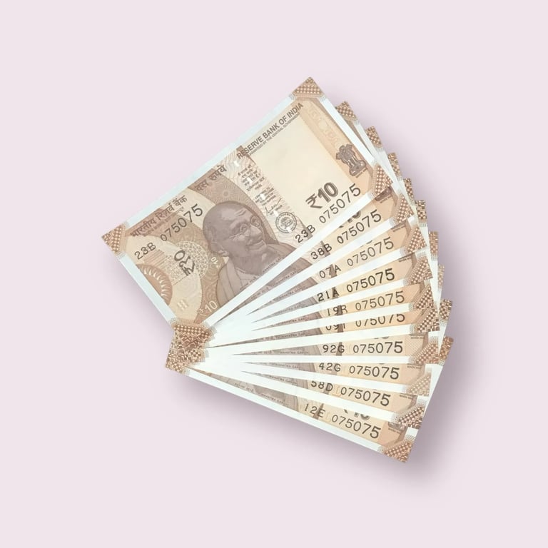RS 10/- INDIA BANK NOTE SEMI FANCY 10 NOTE SAME NUMBER SET 075075 UNIQUE AND RARE
