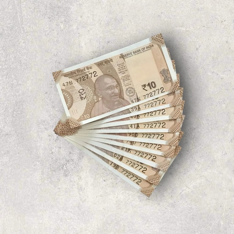 RS 10/- INDIA BANK NOTE SEMI FANCY 10 NOTE SAME NUMBER SET 772772 UNIQUE AND RARE