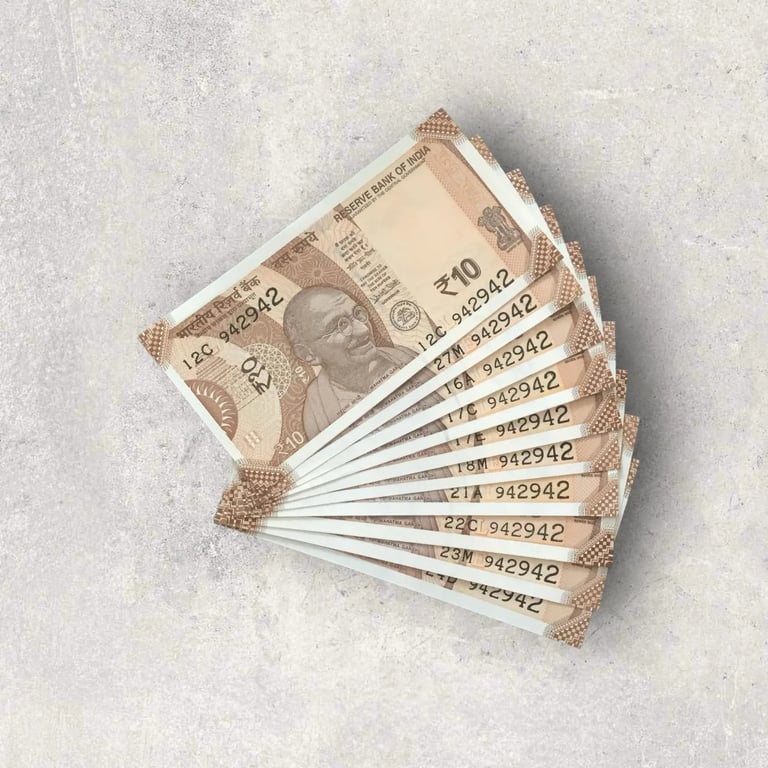 RS 10/- INDIA BANK NOTE SEMI FANCY 10 NOTE SAME NUMBER SET 942942 UNIQUE AND RARE