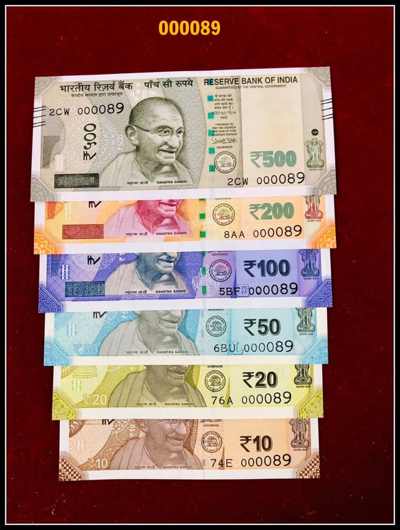 Rs 10 to 500 India Banknote Solid Fancy set 000089 Gem Unc Unique Collection Rare