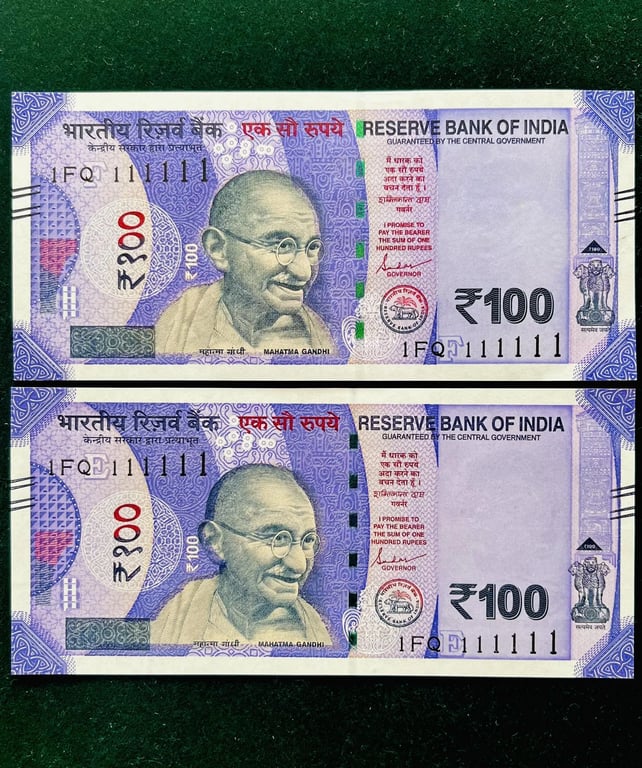 Rs 100 India Banknote TWIN SET Gem Unc Very Unique Solid Number 1FQ 111111
