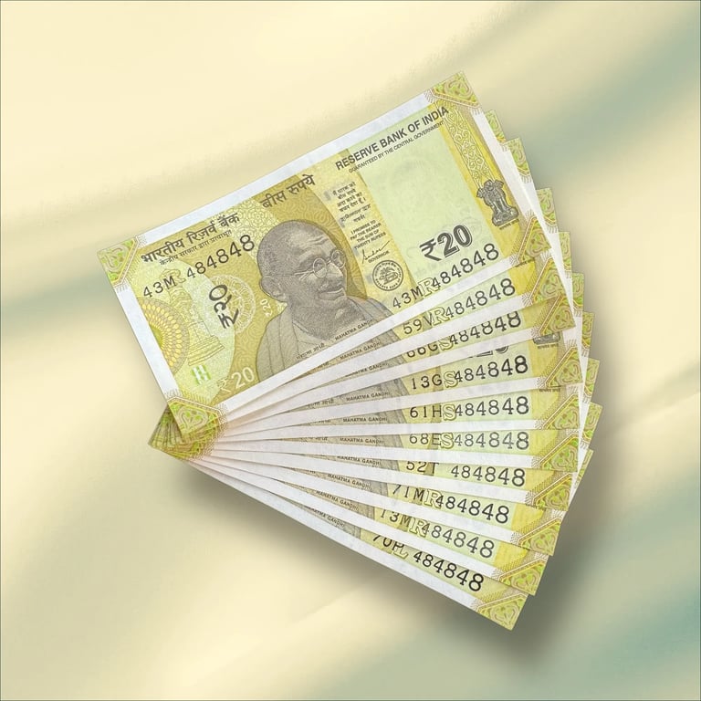 Rs 20/- INDIA Bank note Tripling NO 10 Note Set Number 484848 GEM UNC UNIQUE & RARE
