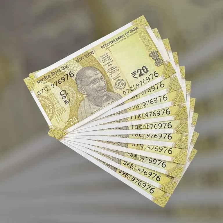 RS 20 INDIA BANK NOTES SEMI FANCY 10 NOTES SAME NUMBER SETS 976976 UNIQUE AND RARE