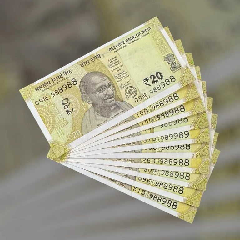 RS 20 INDIA BANK NOTES SEMI FANCY 10 NOTES SAME NUMBER SETS 988988 UNIQUE AND RARE