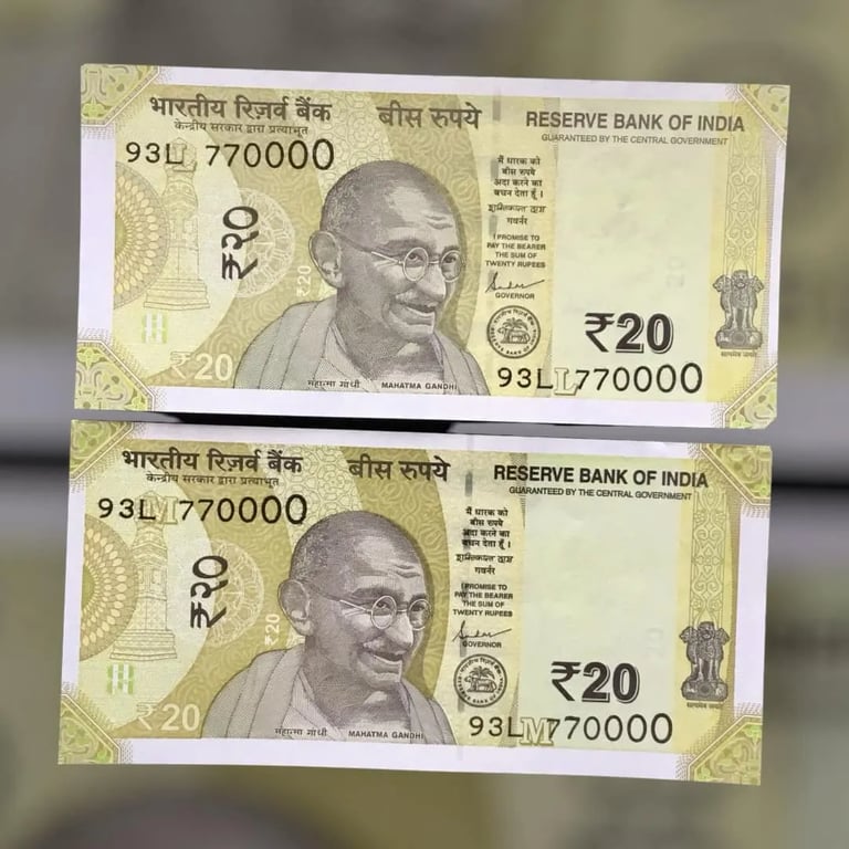RS 20 INDIA BANK NOTES SEMI FANCY TWIN SETS 93L 770000 UNIQUE AND RARE