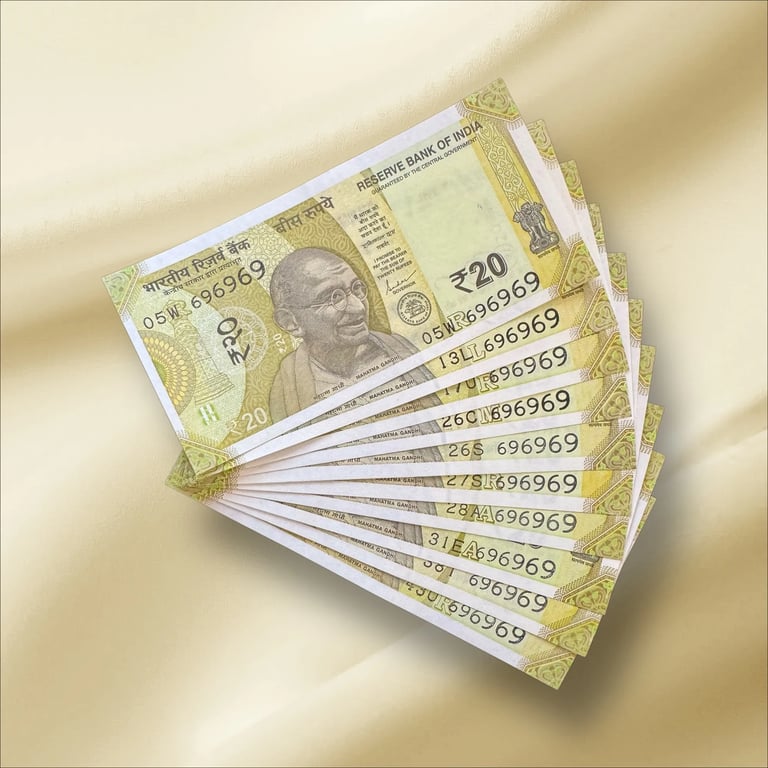 RS 20/- INDIA BANKNOTE same No 10 NOTE SEMI FANCY SET 696969 GEM UNC UNIQUE & RARE