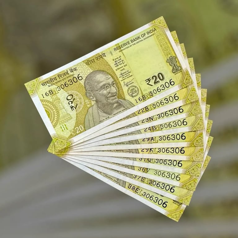 RS 20 INDIA BANKNOTES SEMI FANCY 10 NOTES SAME NUMBER SAME NUMBER SETS 306306 UNIQUE AND RARE