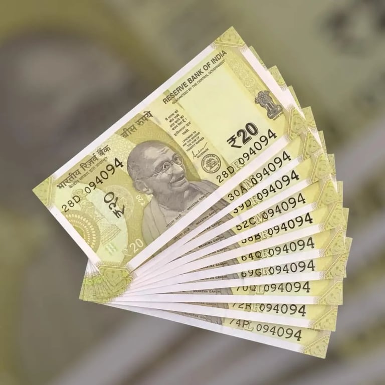 RS 20 INDIA BANK NOTE SEMI FANCY 10 NOTE SAME NUMBER SETS 094094 UNIQUE AND RARE