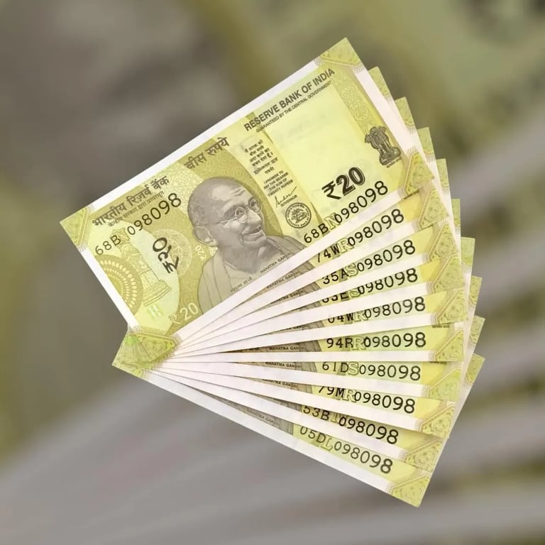 RS 20 INDIA BANK NOTE SEMI FANCY 10 NOTE SAME NUMBER SETS 098098 UNIQUE AND RARE