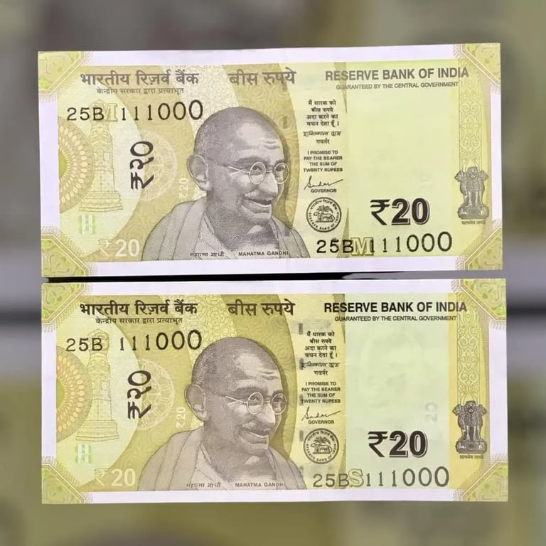 RS 20 INDIA BANKNOTES SEMI FANCY TWIN NOTES SETS 25B 111000 UNIQUE AND RARE