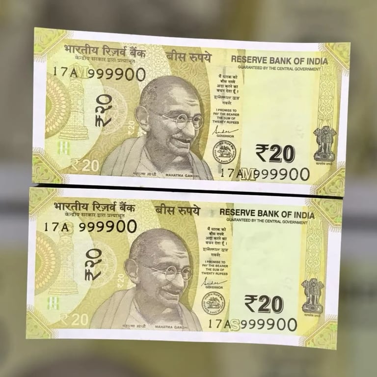 RS 20 INDIA BANKNOTES SEMI FANCY TWIN SETS 17A 999900 UNIQUE AND RARE