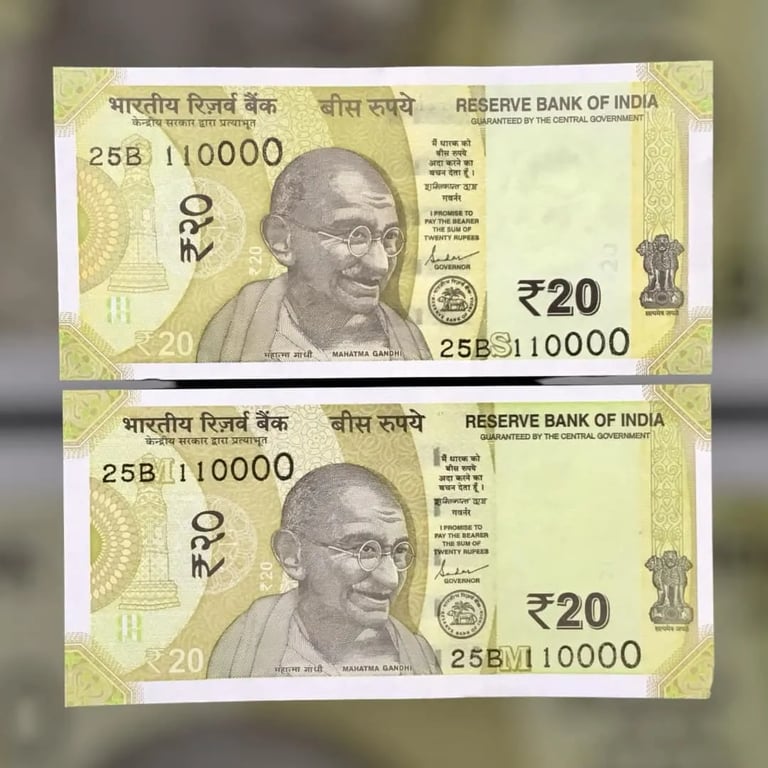 RS 20 INDIA BANKNOTES SEMI FANCY TWIN SETS 25B 110000 UNIQUE AND RARE