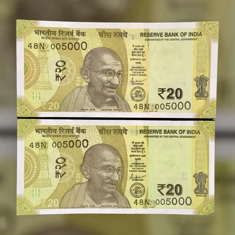 RS 20 INDIA BANKNOTES SEMI FANCY TWIN SETS 48N 005000