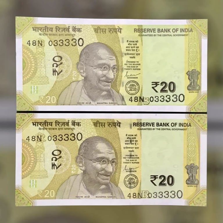RS 20 INDIA BANKNOTES SEMI FANCY TWIN SETS 48N 033330 UNIQUE AND RARE