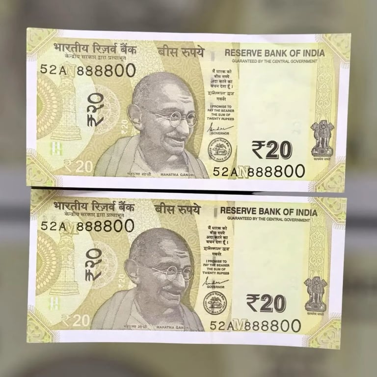 RS 20 INDIA BANKNOTES SEMI FANCY TWIN SETS 52A 888800 UNIQUE AND RARE