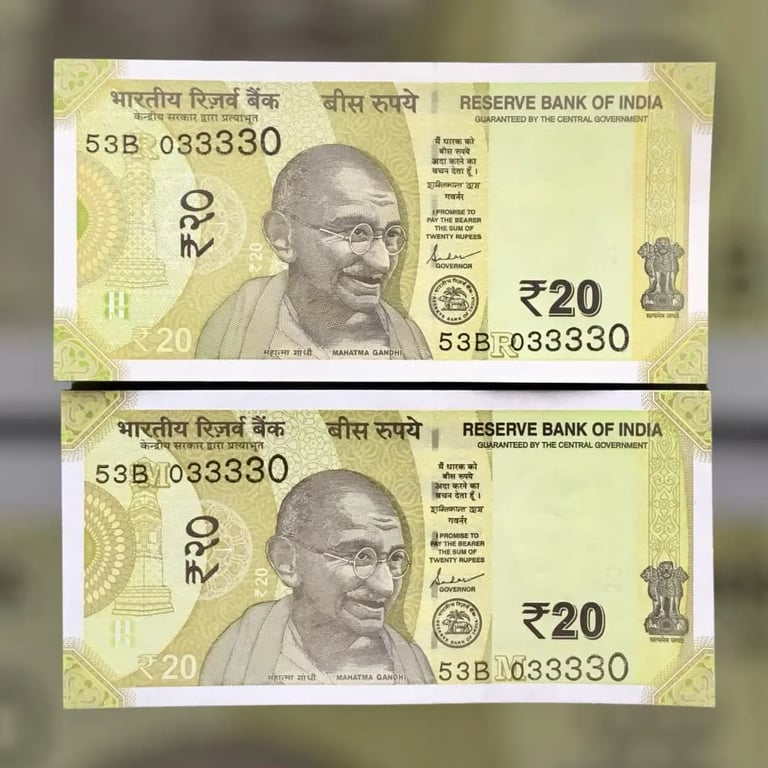 RS 20 INDIA BANKNOTES SEMI FANCY TWIN SETS 53B 033330 UNIQUE AND RARE