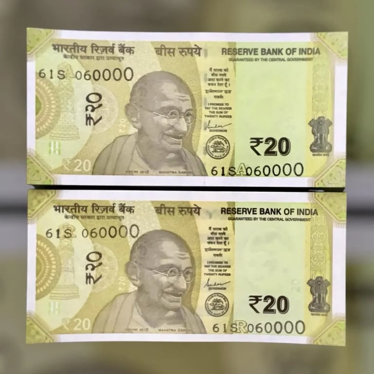 RS 20 INDIA BANKNOTES SEMI FANCY TWIN SETS 61S 060000 UNIQUE AND RARE