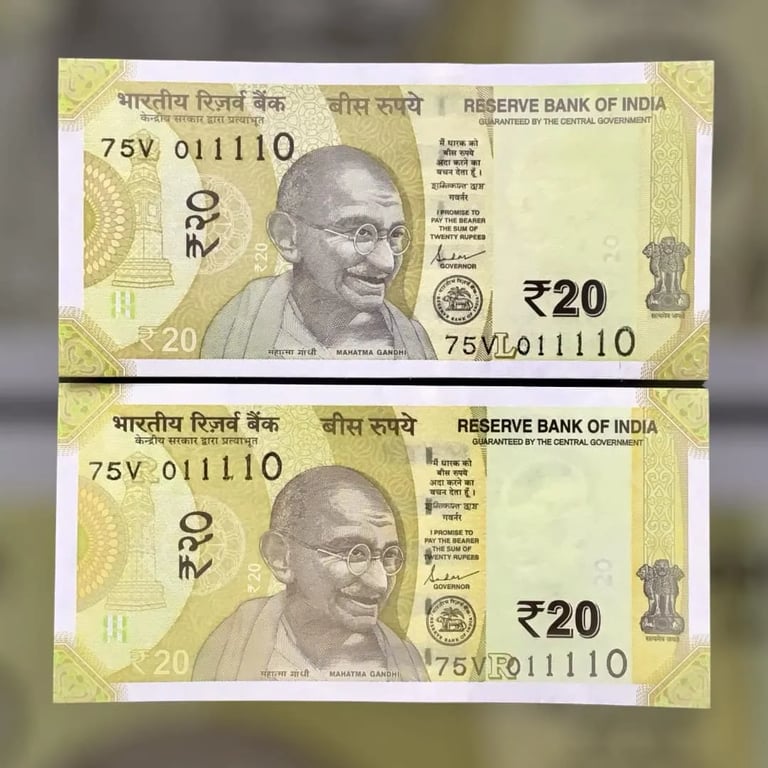 RS 20 INDIA BANKNOTES SEMI FANCY TWIN SETS 75V 011110 UNIQUE AND RARE