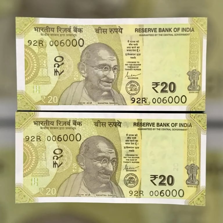 RS 20 INDIA BANKNOTES SEMI FANCY TWIN SETS 92R 006000