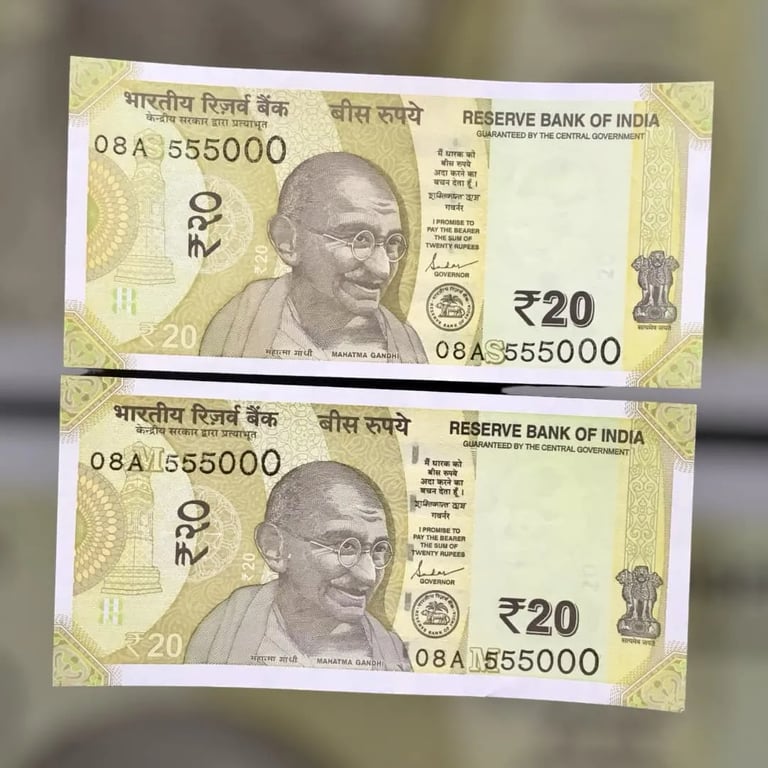 RS 20 INDIA BANKNOTES SEMI MFANCY TWIN SETS 08A 555000 UNIQUE AND RARE