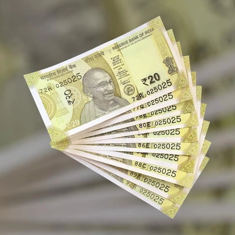 RS 20 INDIA BANKNOTES SEMIFANCY 10 NOTES SAME NUMBER SETS 025025 UNIQUE AND RARE