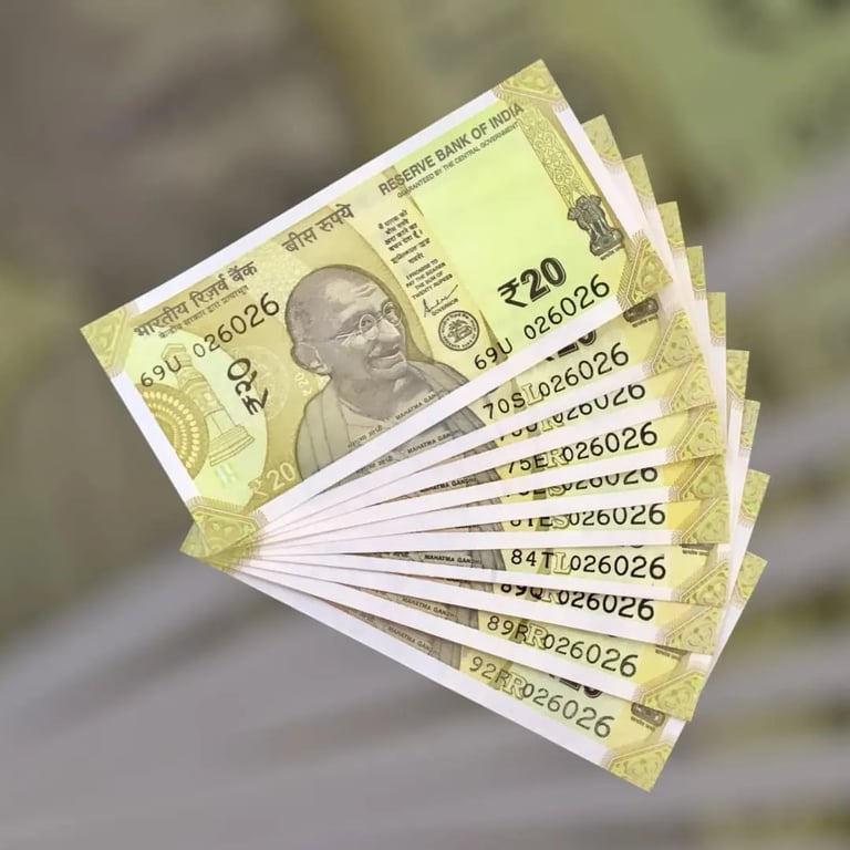 RS 20 INDIA BANKNOTES SEMIFANCY 10 NOTES SAME NUMBER SETS 026026 UNIQUE AND RARE