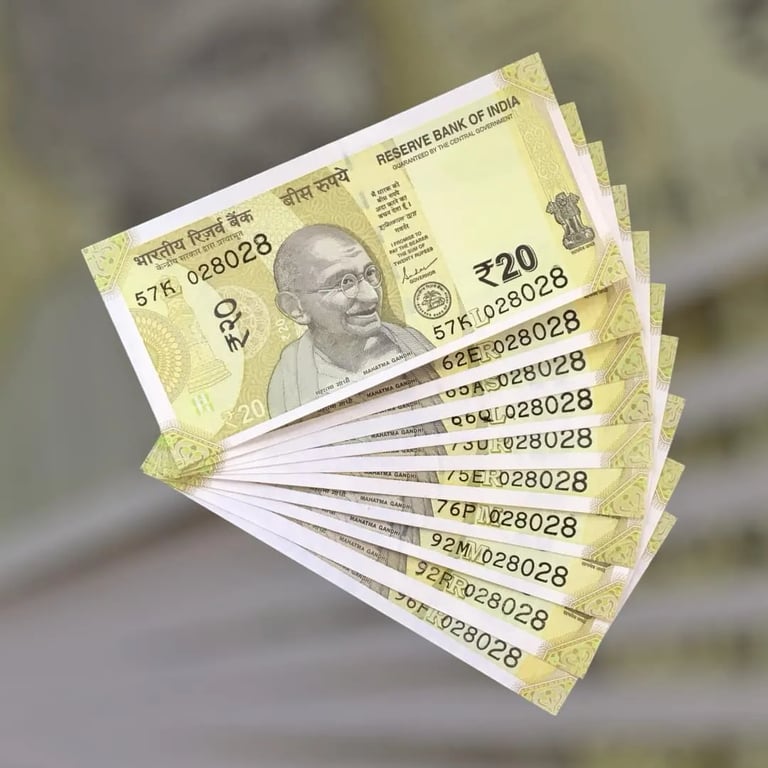RS 20 INDIA BANKNOTES SEMIFANCY 10 NOTES SAME NUMBER SETS 028028 UNIQUE AND RARE