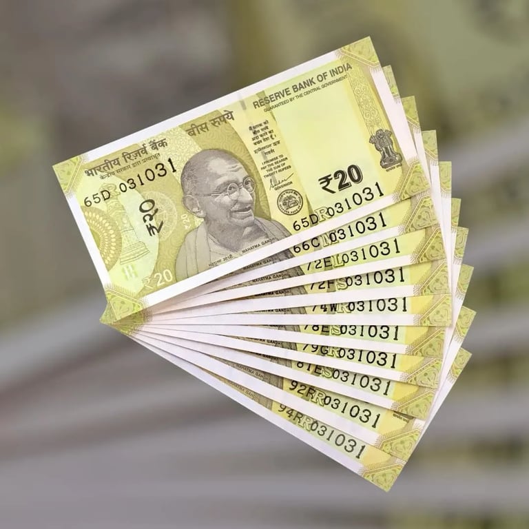 RS 20 INDIA BANK NOTE SEMI FANCY 10 NOTE SAME NUMBER SETS 031031 UNIQUE AND RARE