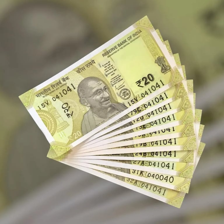 RS 20 INDIA BANK NOTE SEMI FANCY 10 NOTE SAME NUMBER SETS 041041 UNIQUE AND RARE