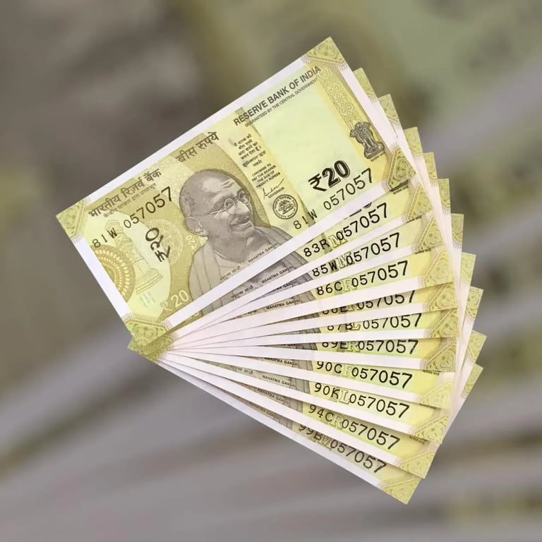 RS 20 INDIA BANKNOTES SEMIFANCY 10 NOTES SAME NUMBER SETS 057057 UNIQUE AND RARE
