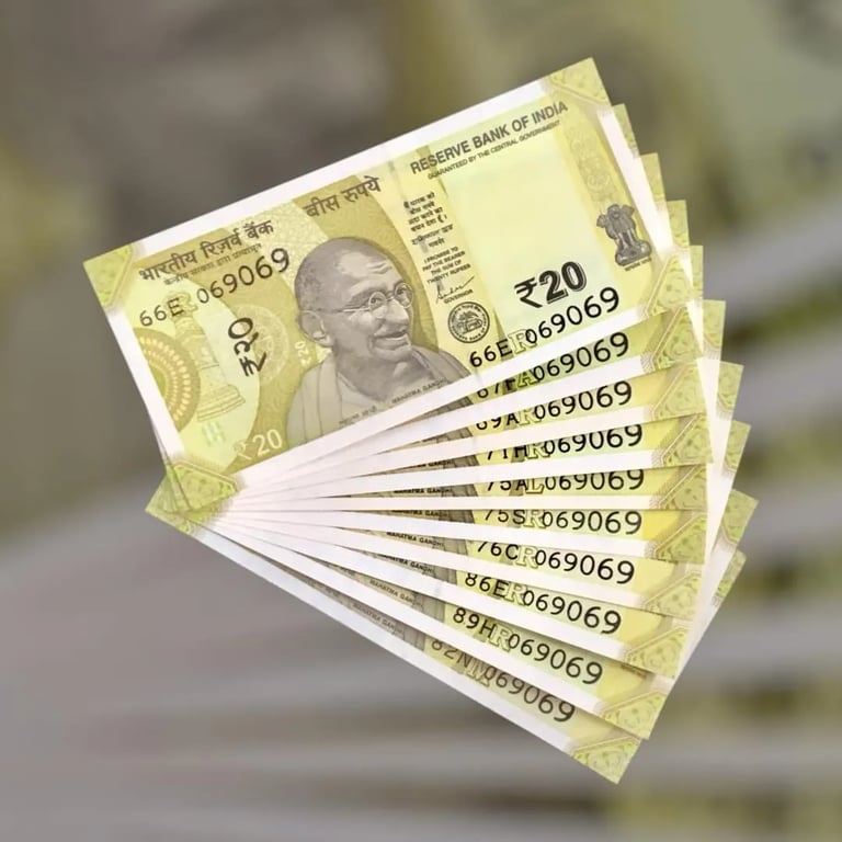 RS 20 INDIA BANKNOTES SEMIFANCY 10 NOTES SAME NUMBER SETS 069069 UNIQUE AND RARE