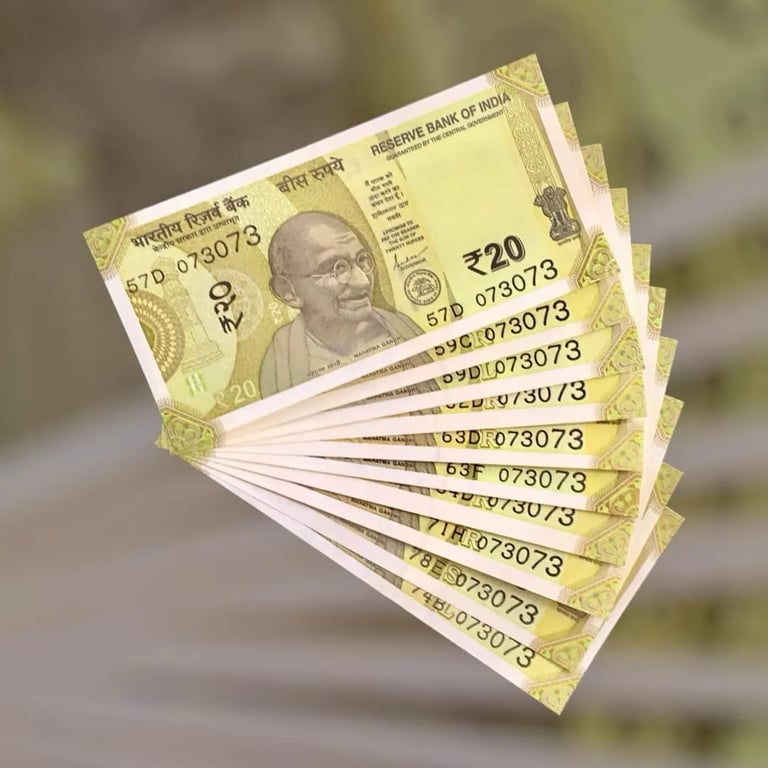 RS 20 INDIA BANKNOTES SEMIFANCY 10 NOTES SAME NUMBER SETS 073073 UNIQUE AND RARE