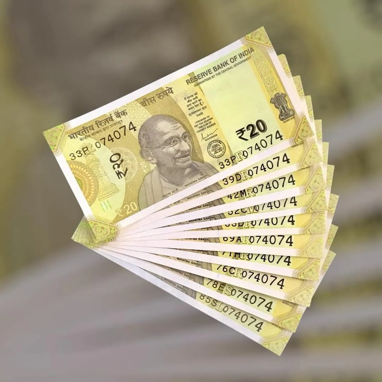RS 20 INDIA BANKNOTES SEMIFANCY 10 NOTES SAME NUMBER SETS 074074 UNIQUE AND RARE