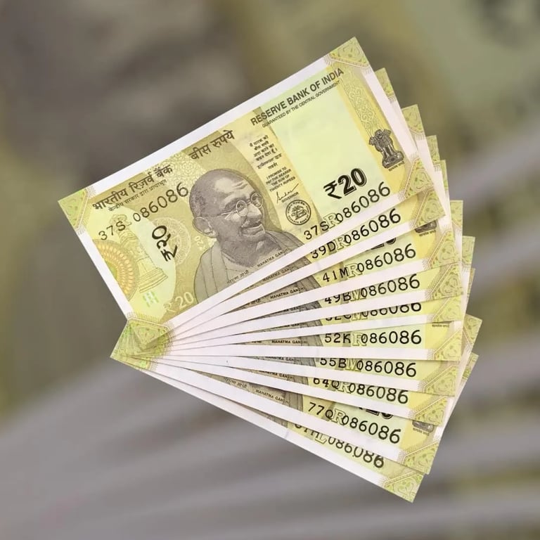RS 20 INDIA BANKNOTES SEMIFANCY 10 NOTES SAME NUMBER SETS 086086 UNIQUE AND RARE