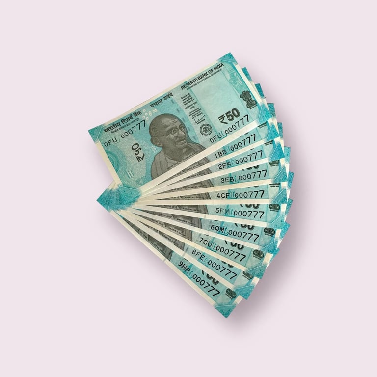 RS 50/- INDIA BANK NOTE SEMI FANCY 10 NOTE SAME NUMBER SET 000777 UNIQUE AND RARE