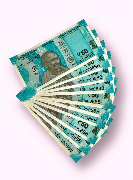 RS 50/- INDIA BANK NOTE SEMI FANCY 10 NOTE SAME NUMBER SET 000888 UNIQUE AND RARE